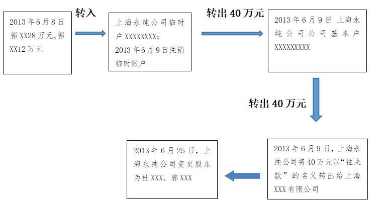 根据申请人提交的证据2 银行转账记录1 显示:2013年6月8日,郭XX和郭XX分别将28万元、12万元转入上海永纯公司的临时账户XXXXXXXXX。2013年6月9日,上海永纯公司将临时账户内的40万全部转至公司的基本账户XXXXXXXXXX,后注销公司的临时户。